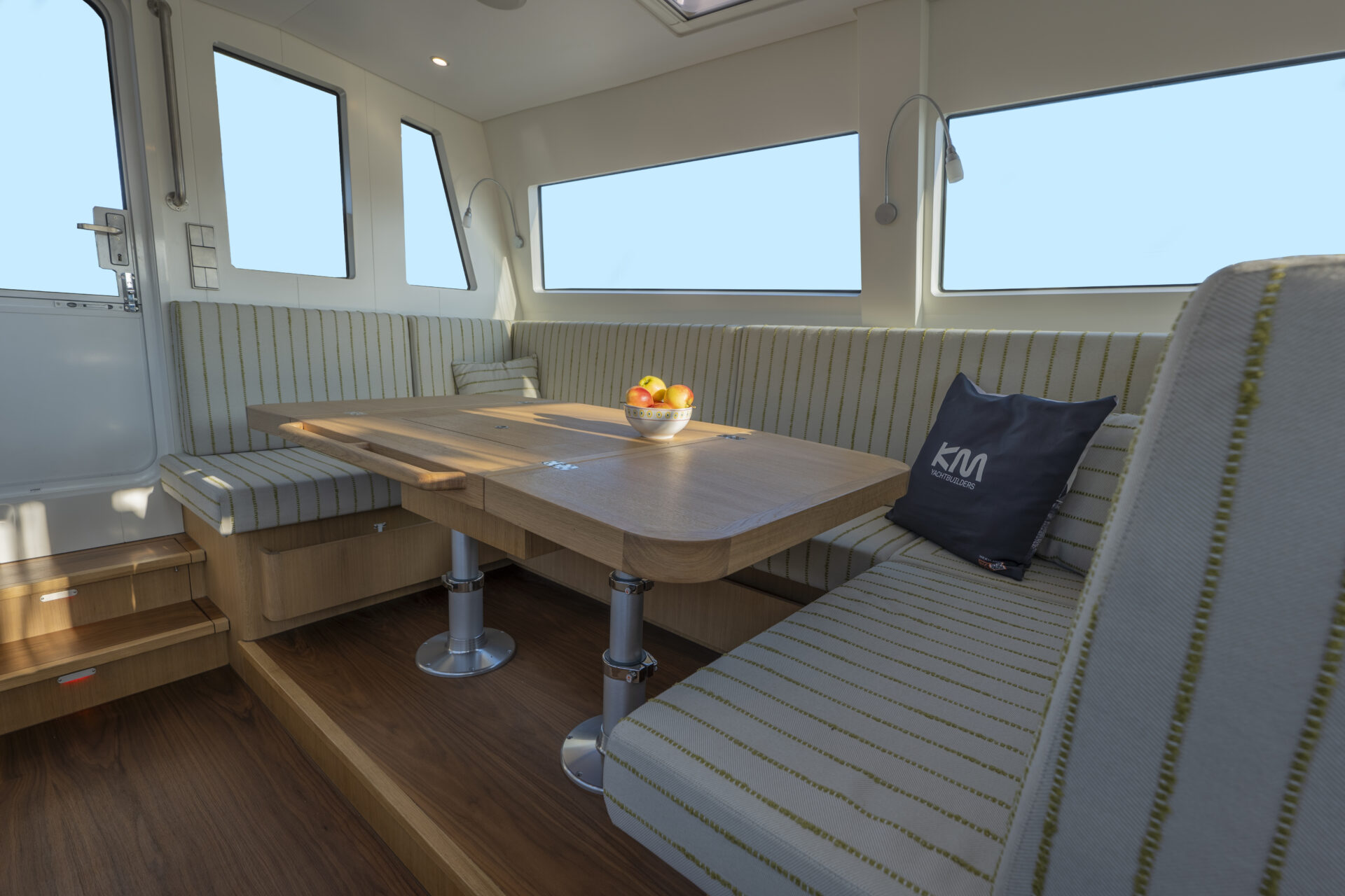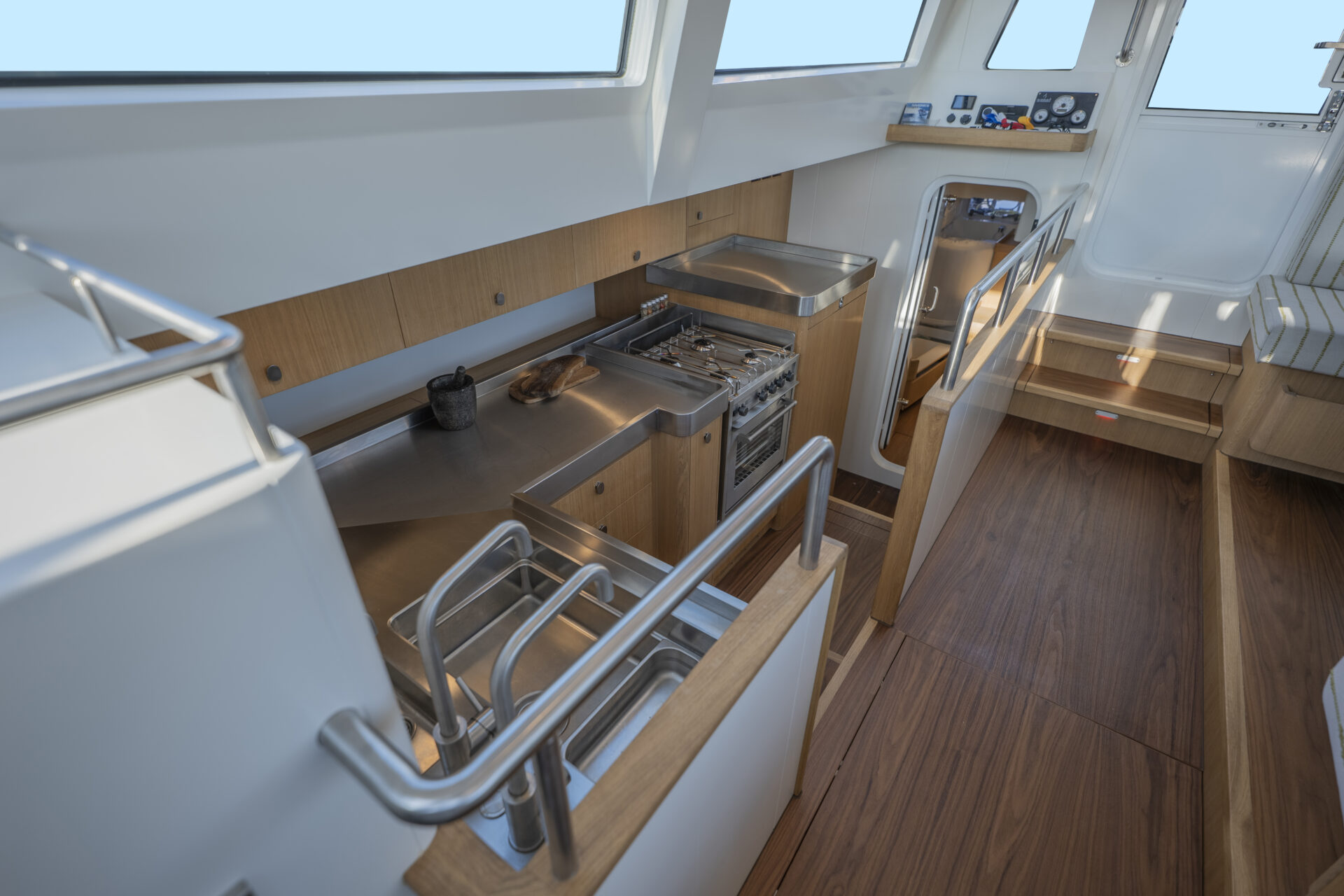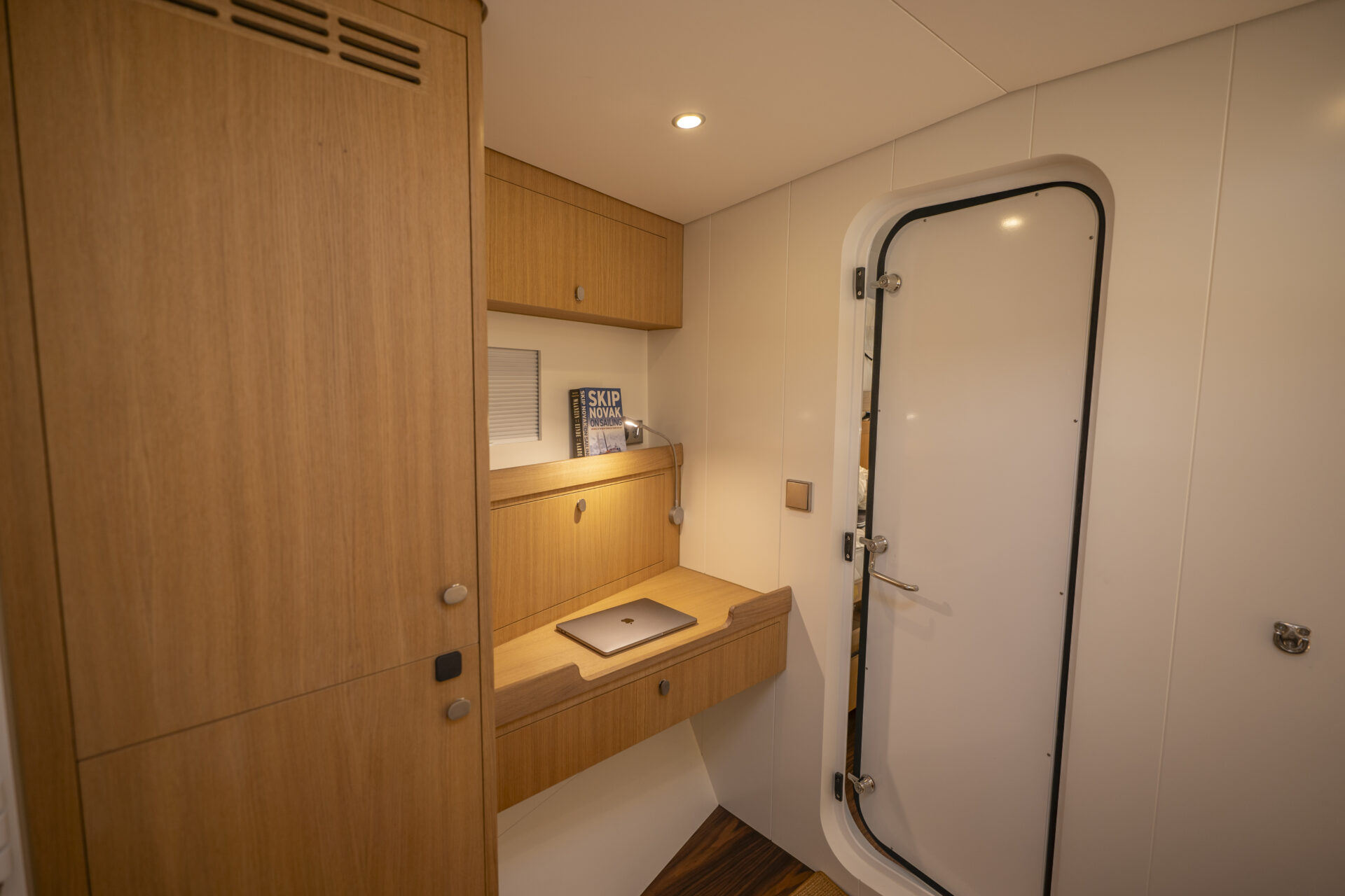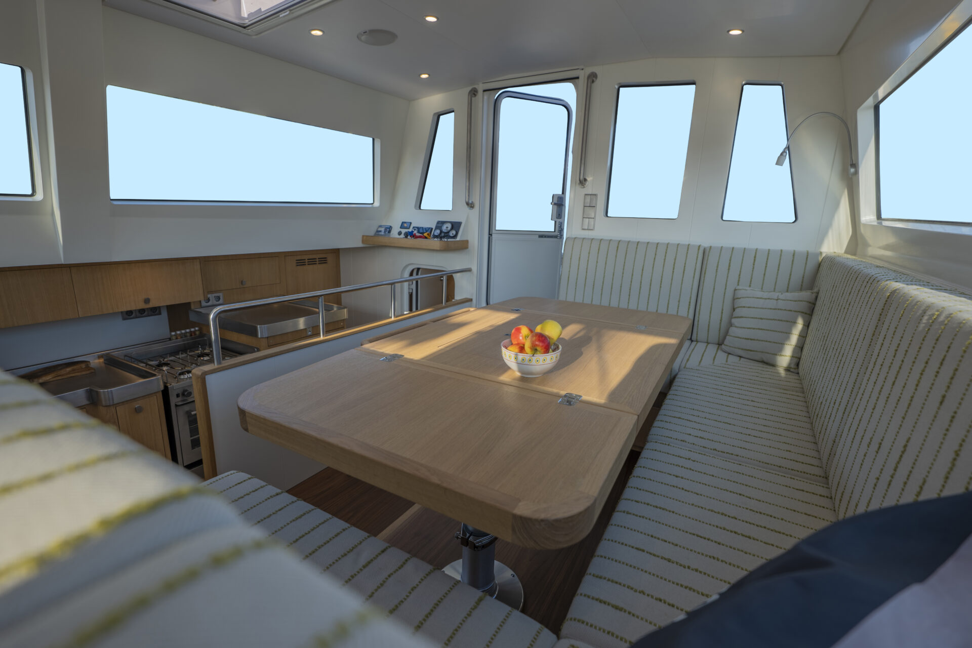 Below deck, the interior follows the same thoughtful design: natural, warm tones create a comfortable and practical living space — perfect for long passages.