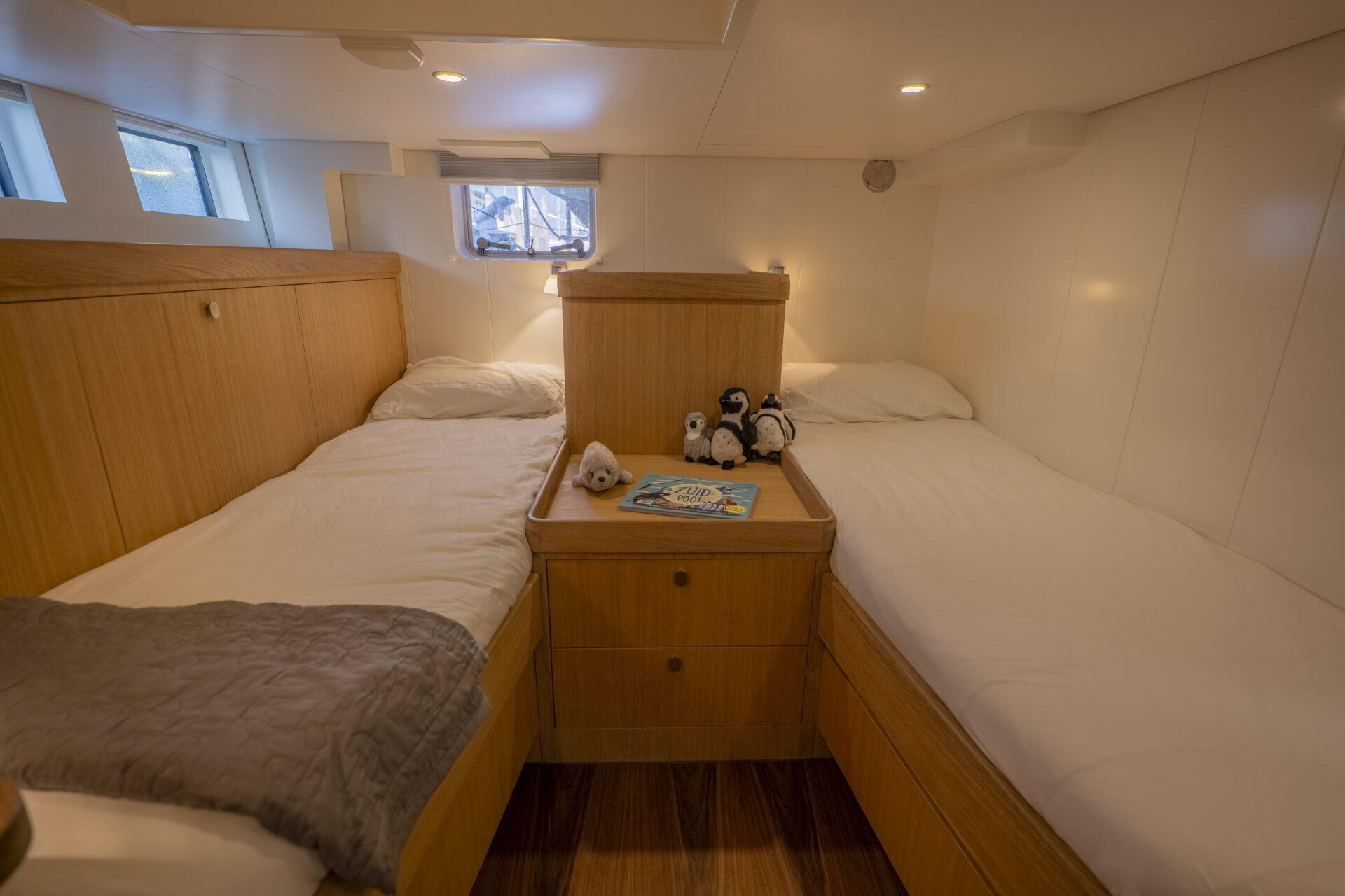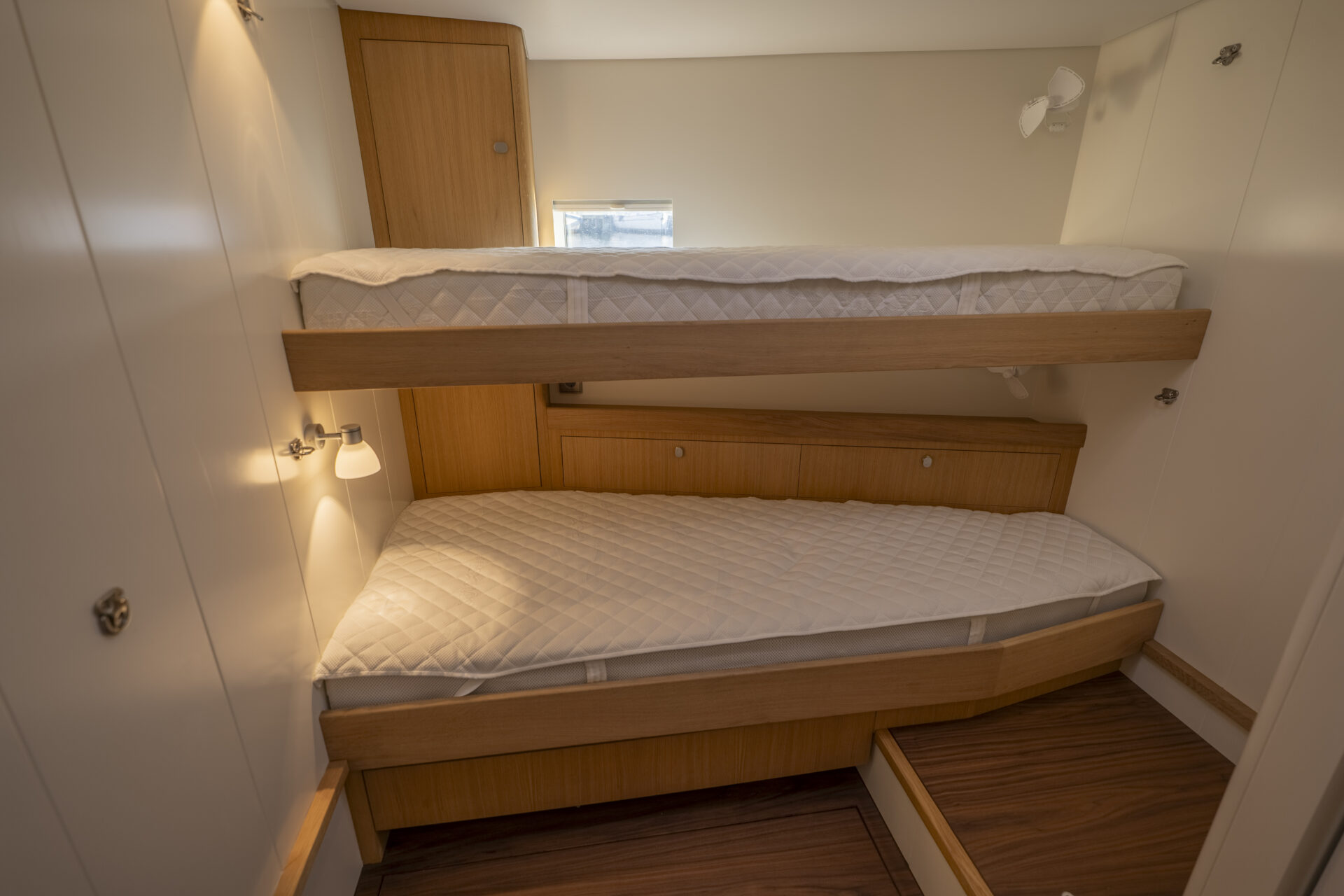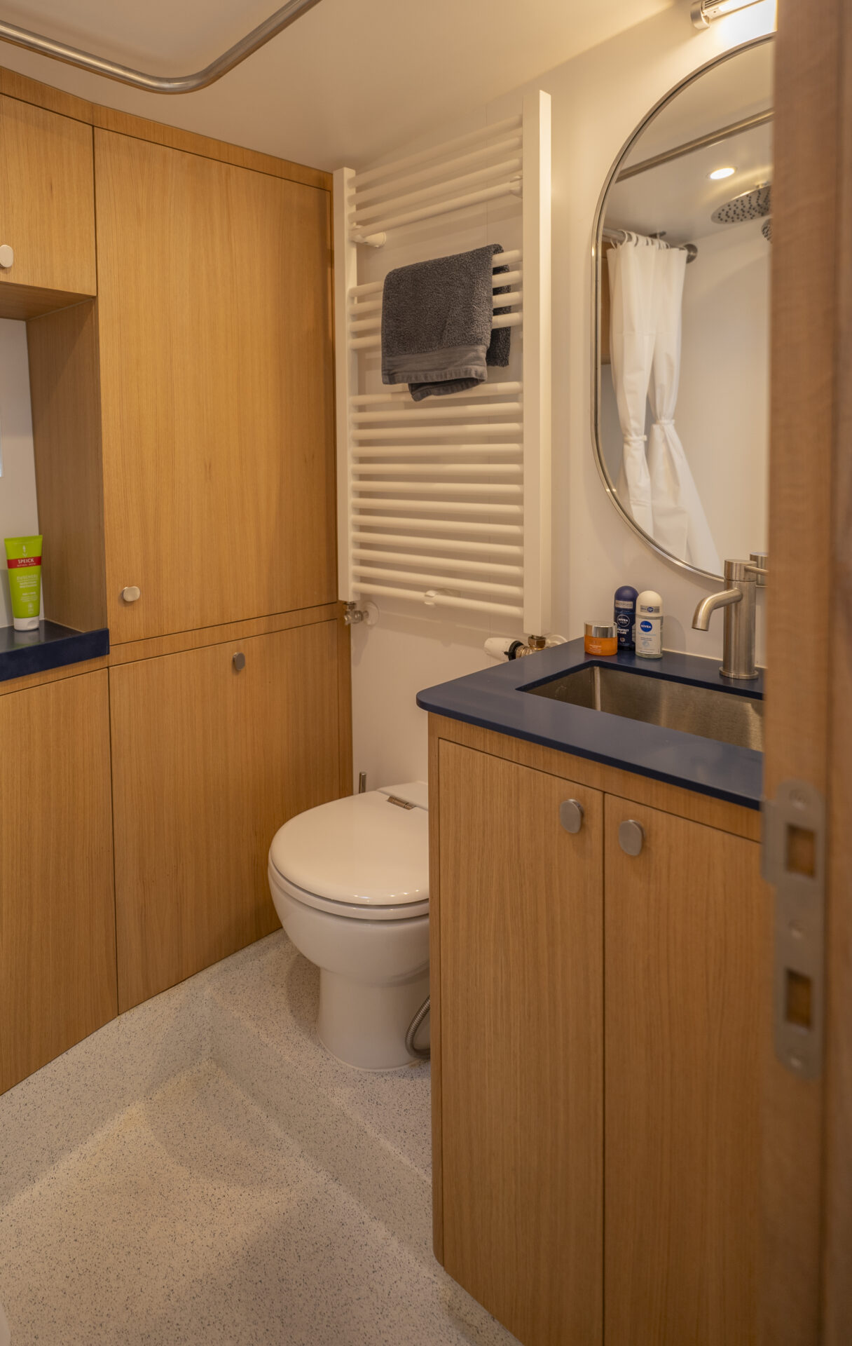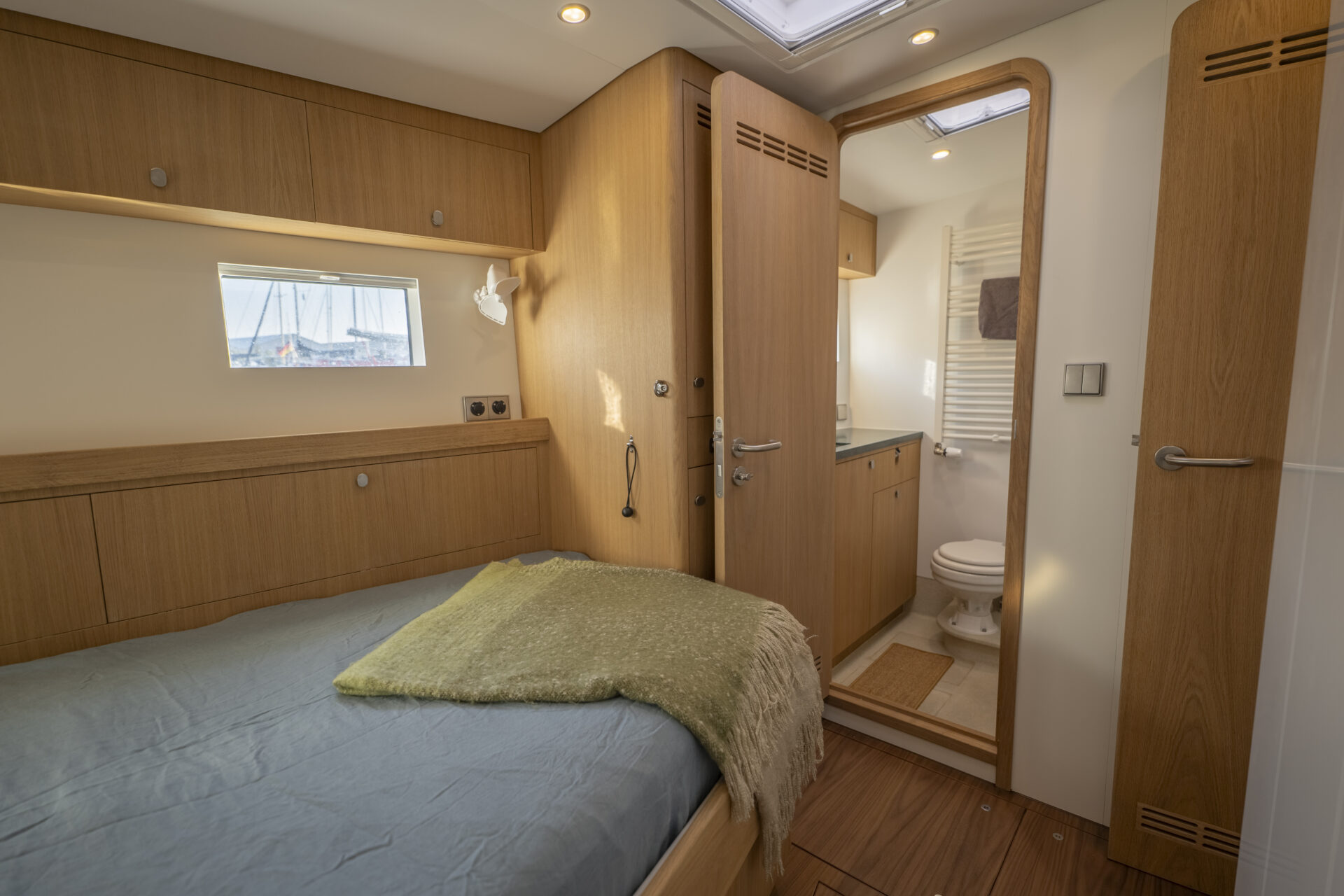 Below deck, the interior follows the same thoughtful design: natural, warm tones create a comfortable and practical living space — perfect for long passages.