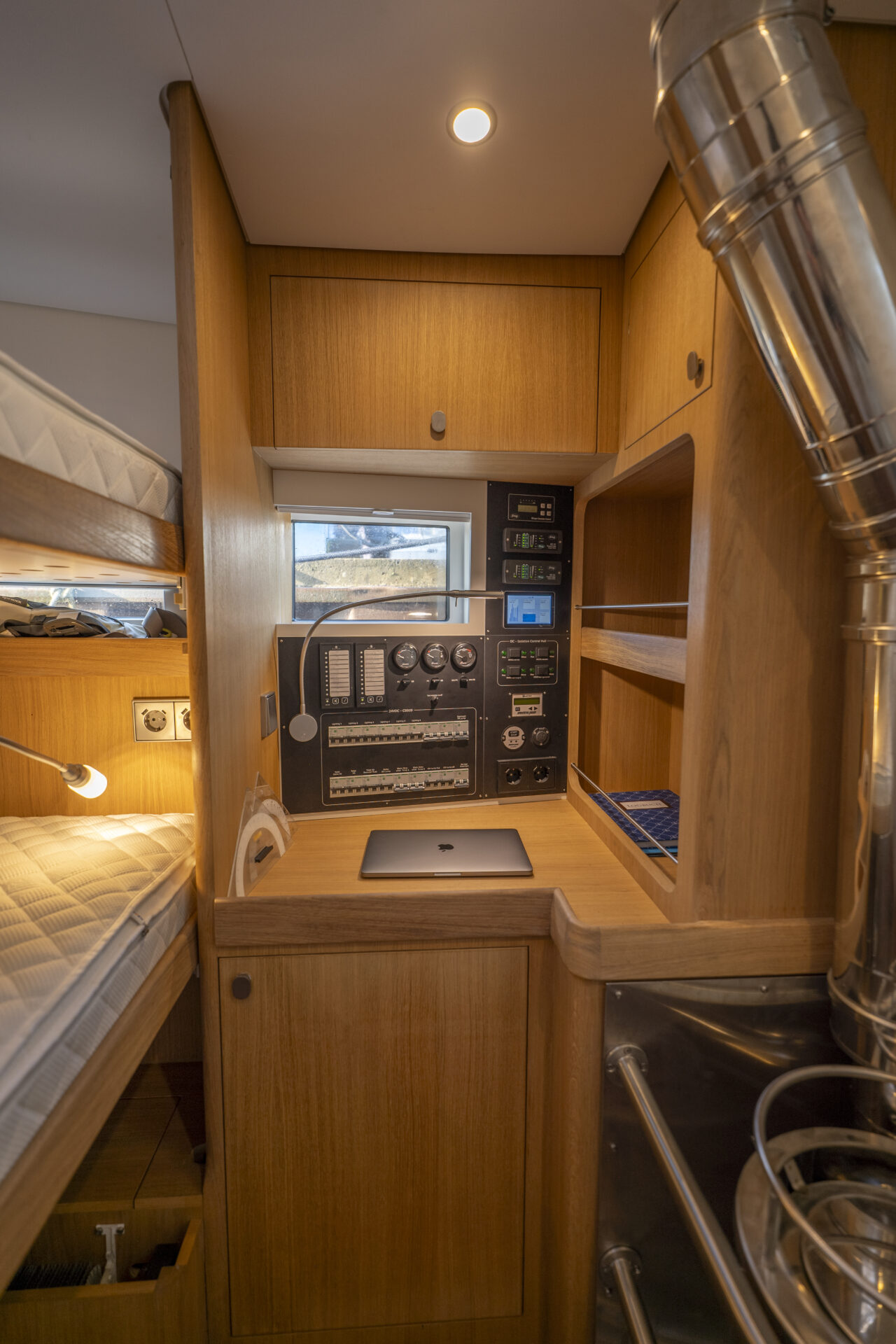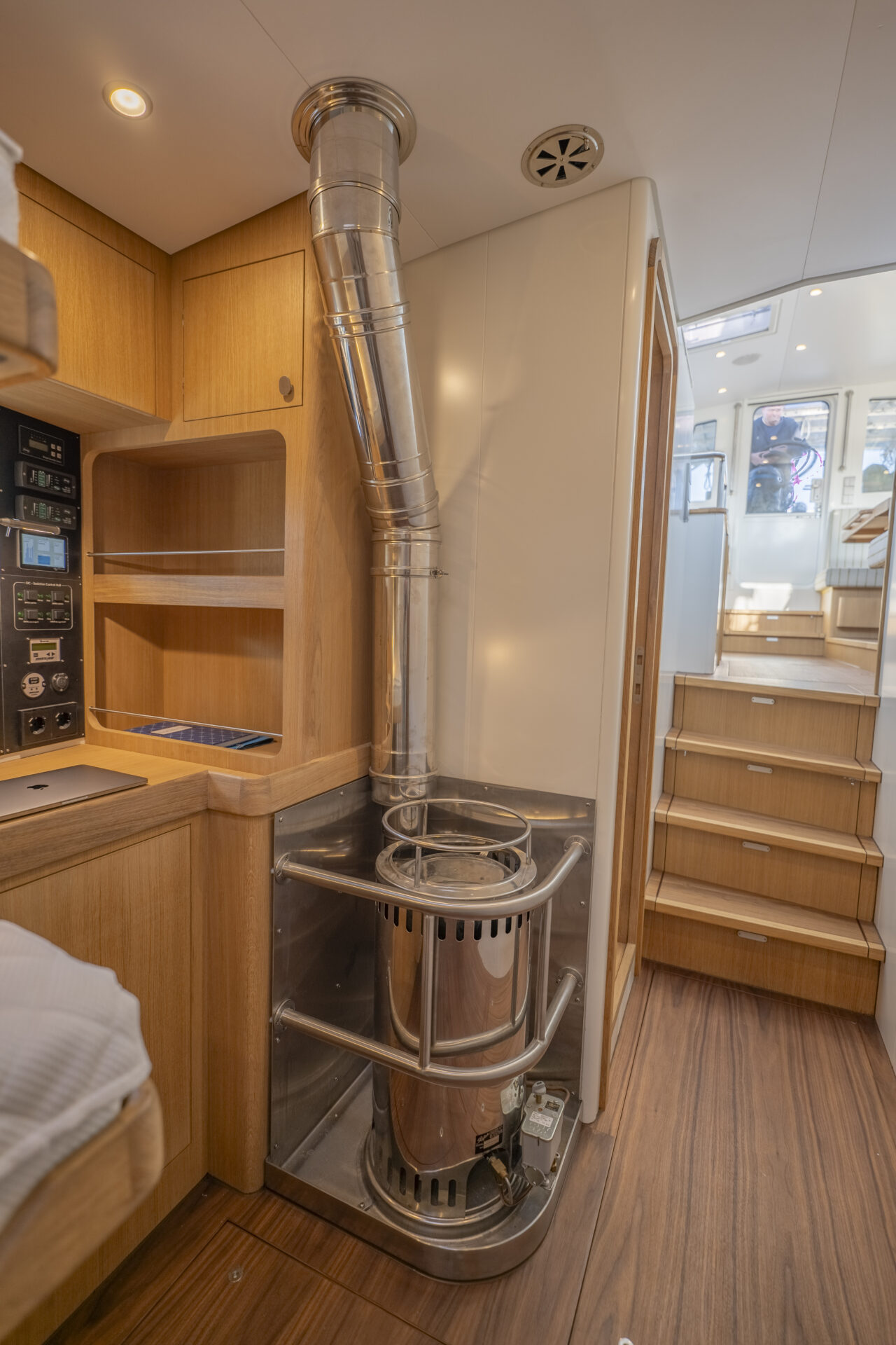 A large aft platform provides easy access to the water and space for the tender, while solar panels on the arch and pilothouse support sustainable, off-grid cruising. Below deck, a generous workshop offers ample room for tools and spare parts — ideal for extended voyages far from shore.