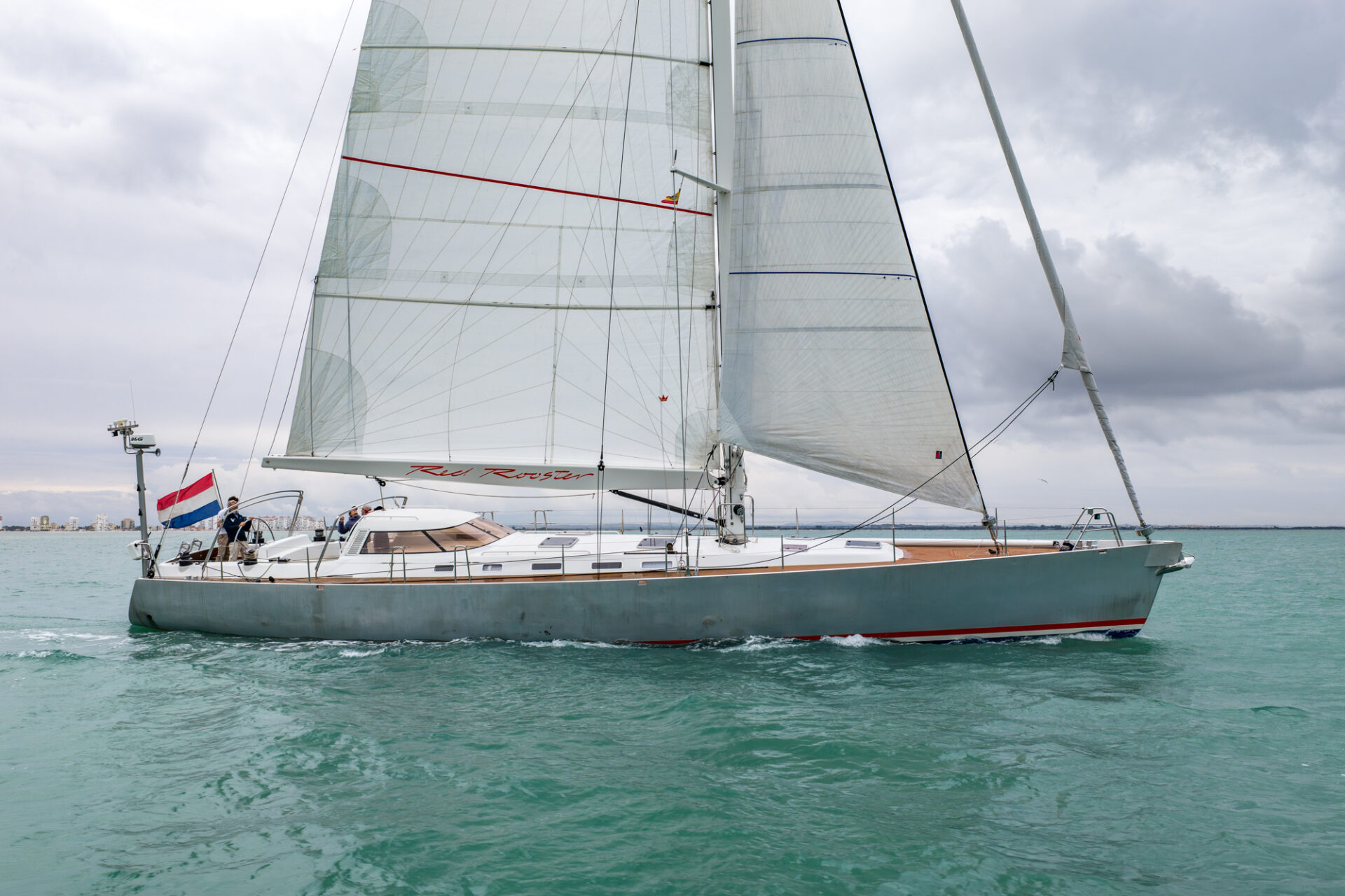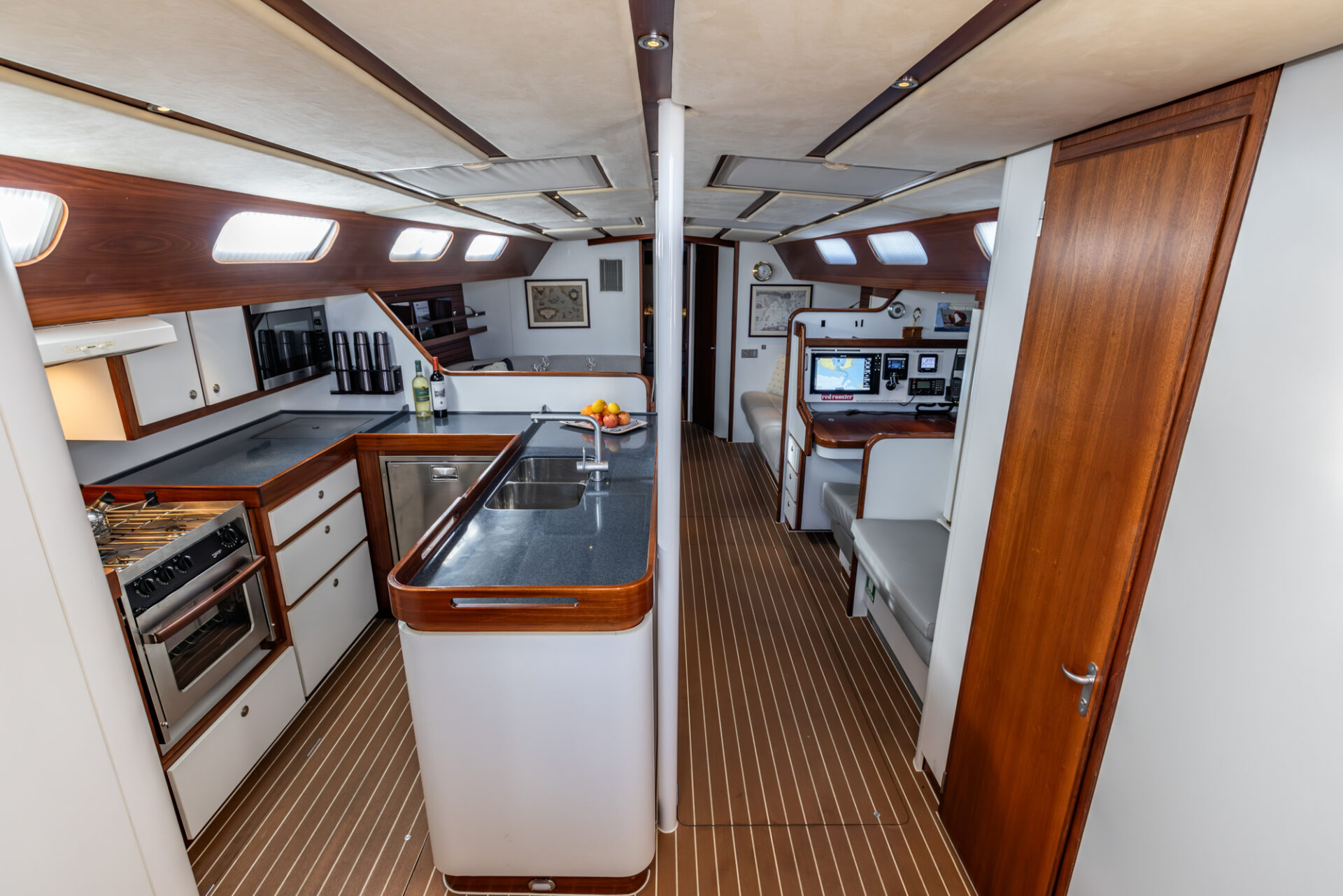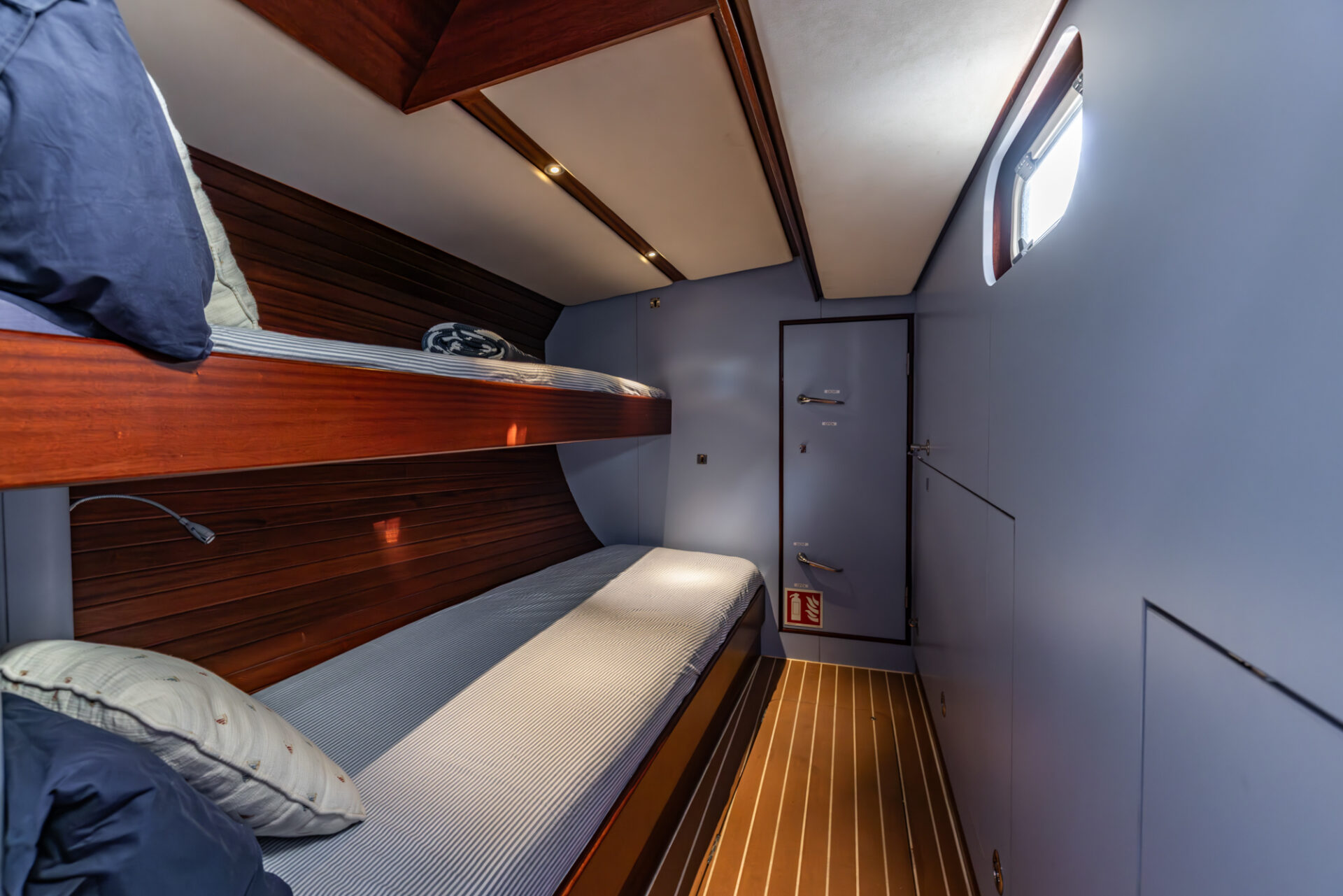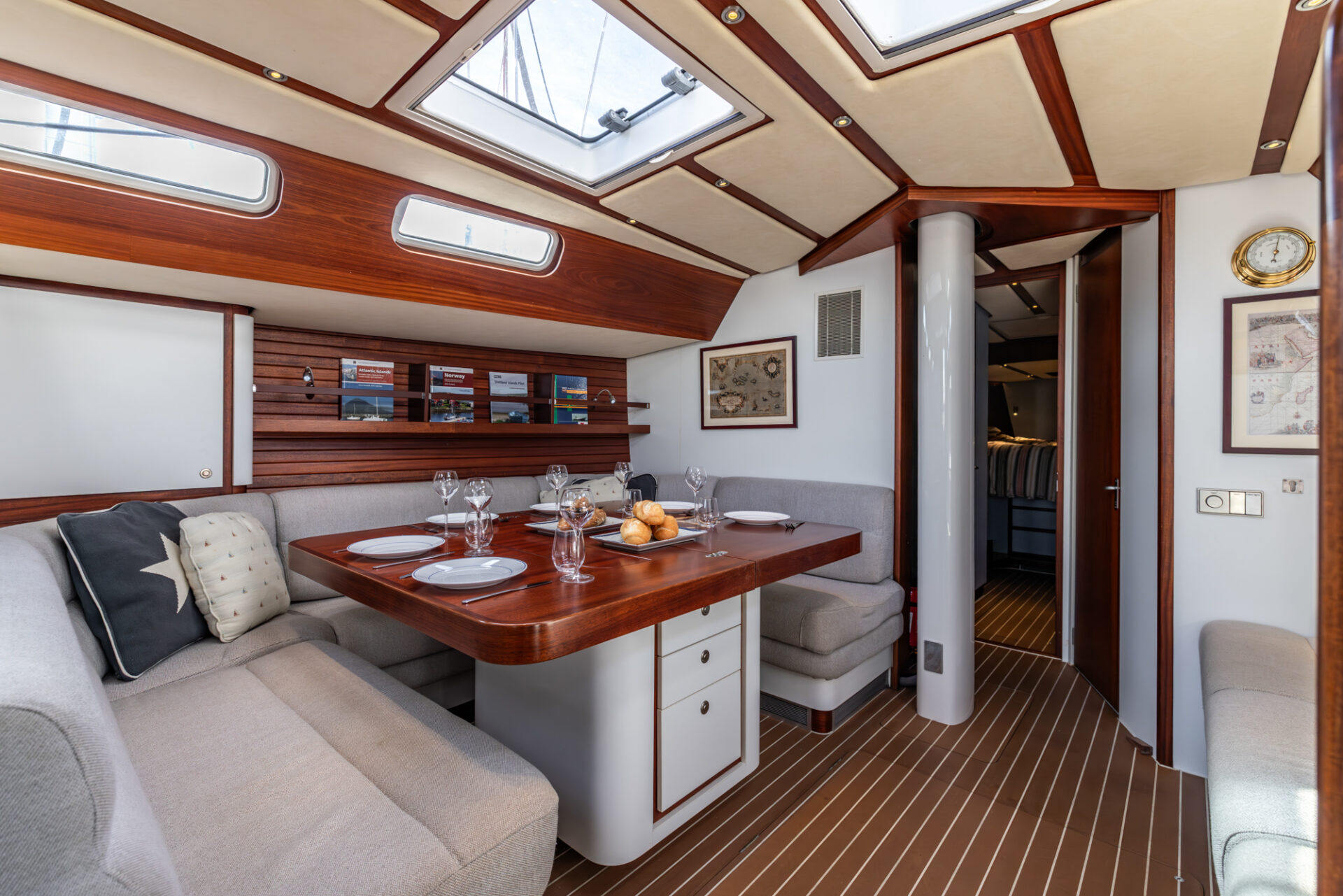 Below deck, the mahogany interior accommodates eight guests in four cabins, including a generous owner’s suite. A robust and well-equipped yacht, built for reliable offshore sailing.
